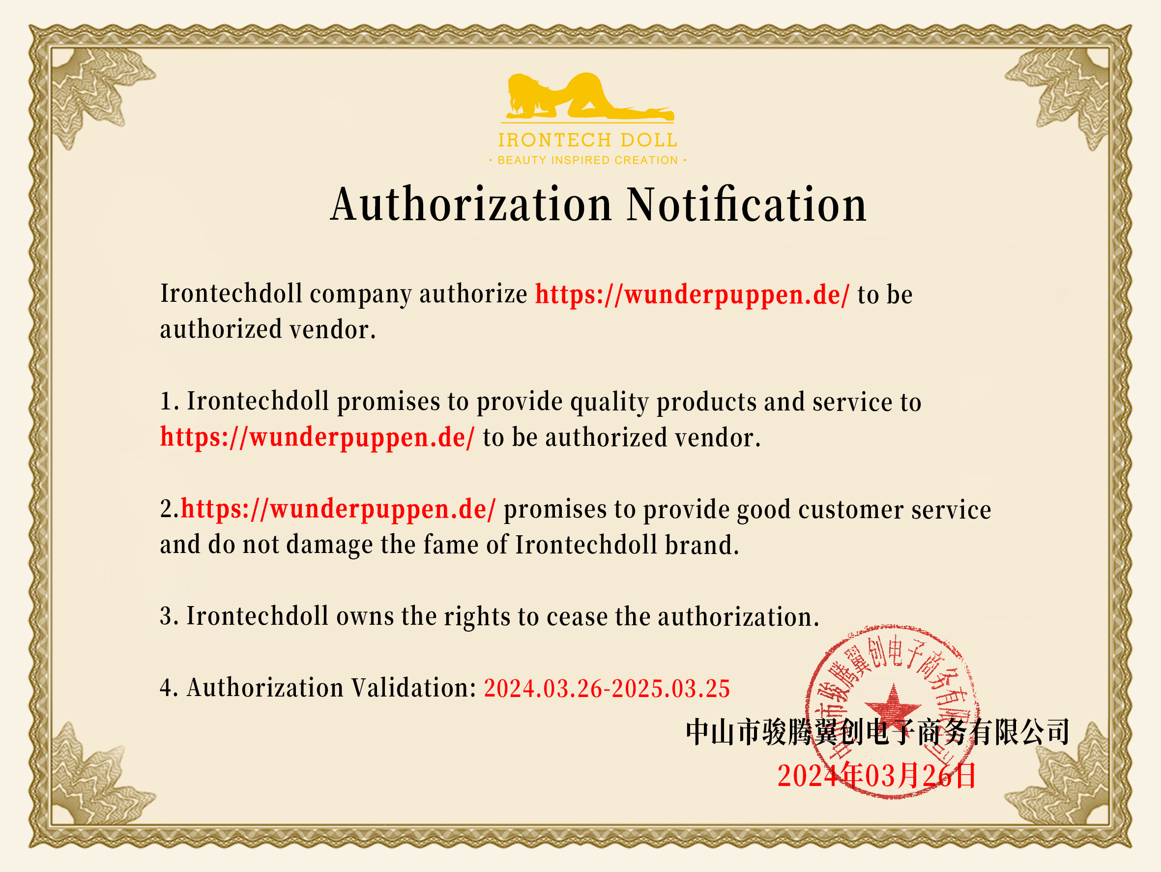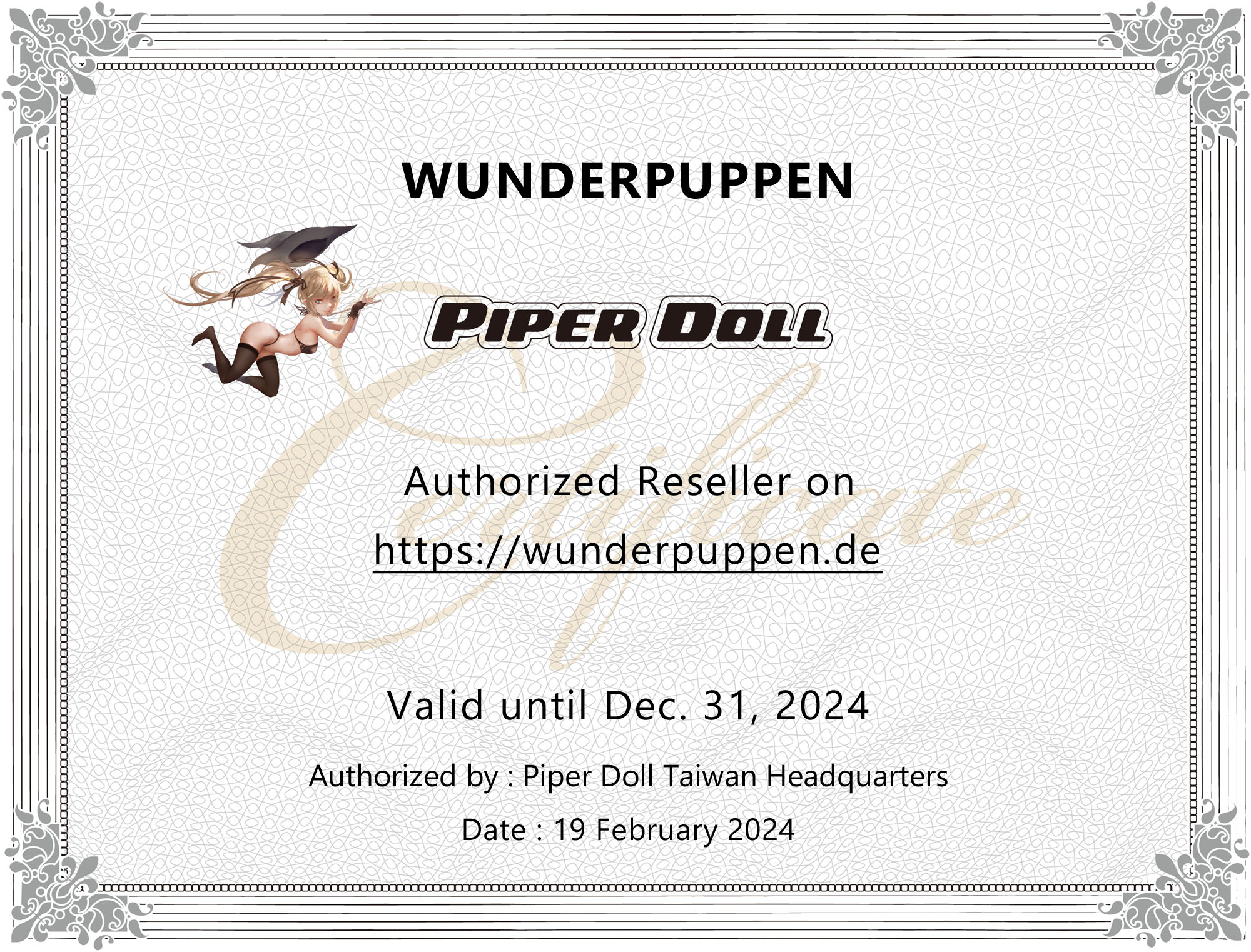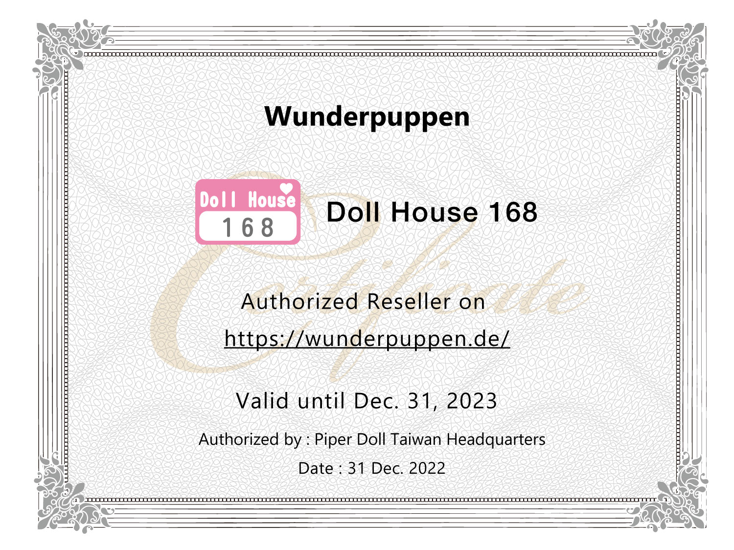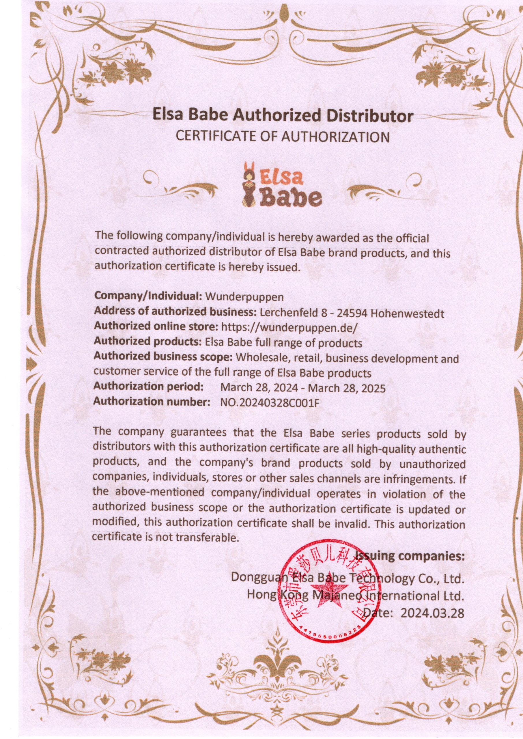 Als Zeichen der guten Zusammenarbeit zwischen Wunderpuppen und den jeweiligen Herstellern, bekommen wir nach einer gewissen Zeit beglaubigte Zertifikate ausgestellt. Die folgenden Zertifikate stehen für originale Produkte, stabile Kooperationen und ausnahmslose Qualität.