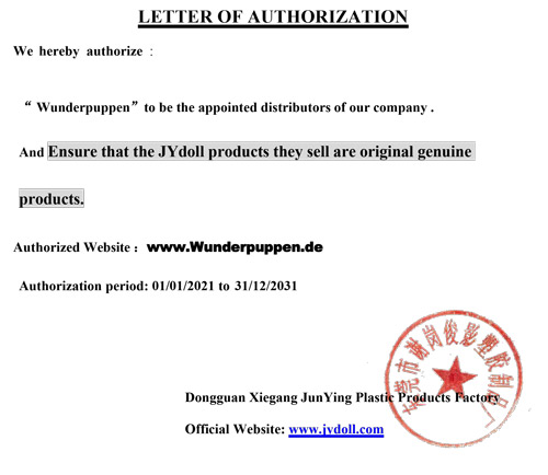 Beachte bitte, dass wir nicht alle Zertifikate vorlegen können, da für einige Hersteller eine gewisse monatliche Mindestabnahmemenge erfolgen muss. Da wir ein verhältnismäßig kleines Unternehmen sind und bei uns eine Puppe nach der anderen bearbeitet wird, haben wir auch geringere Durchsatzmengen. Dennoch sind wir von den Herstellern authorisiert, dessen originale Produkte zu verkaufen. Selbstverständlich können unsere Kunden auch bei den angebotenen Herstellern unsere Vertrauenswürdigkeit erfragen.