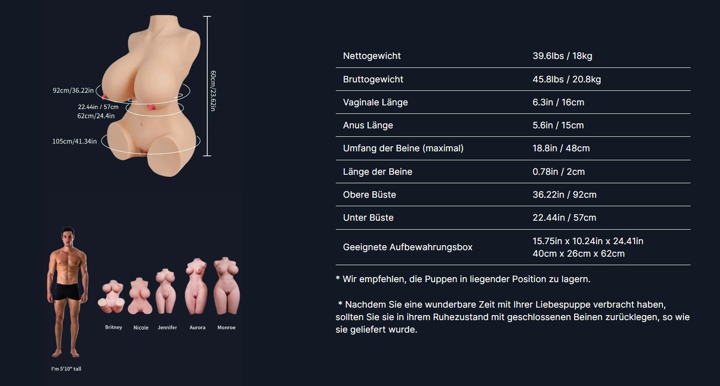 - Alle Sexpuppen werden in einem neuen, originalen und einwandfreien Zustand, wie auf der Website beschrieben angezeigt und an dich verschickt.