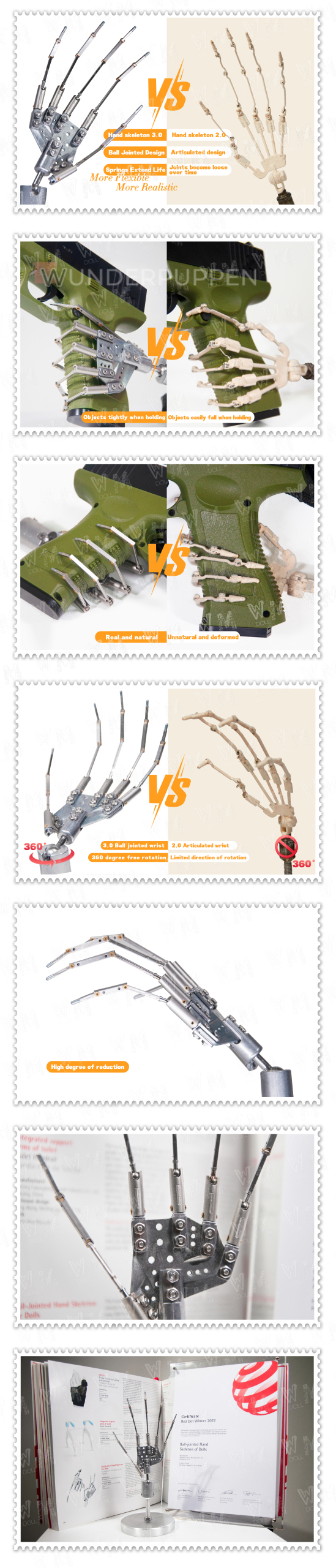 Dieses Handskelett für TPE und Silikonpuppen kann Fingerbewegungen realistisch nachahmen. Durch Kugellager und ein auf Federspannung basierendes System können die Finger in jede gewünschte Position gebracht werden. Die Fingergelenke sind mit weichen Druckfedern ausgestattet. Durch das Spannen der Federn entsteht ein definierter Reibungswiderstand zwischen Kugelkopf und Kugellager in den Fingergelenken. Dies hält den Finger nicht nur in Position, sondern ermöglicht auch eine Drehung. Das integrierte Dämpfungssystem verhindert Gelenkbrüche. Das Skelett besteht hauptsächlich aus verschleißfestem, recycelbarem Stahl.