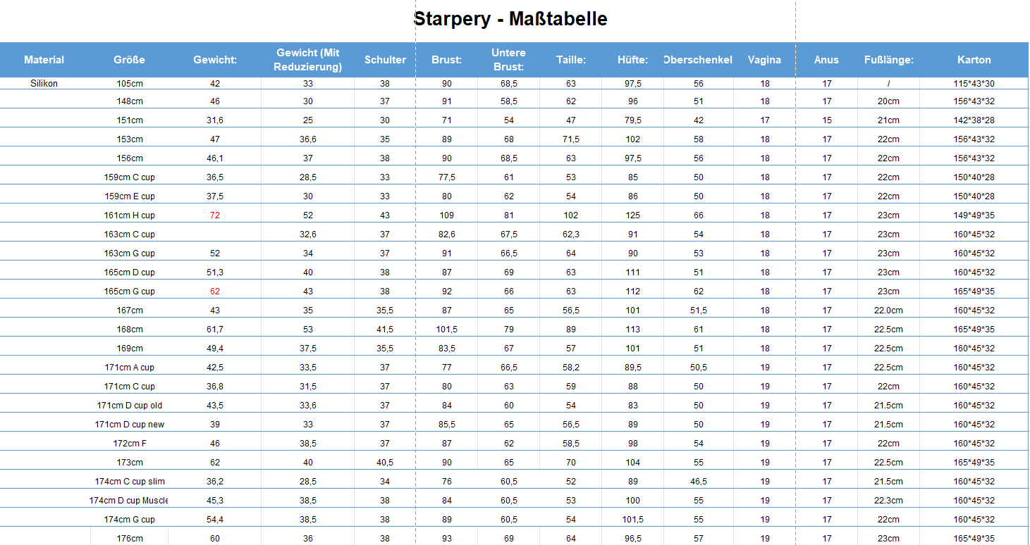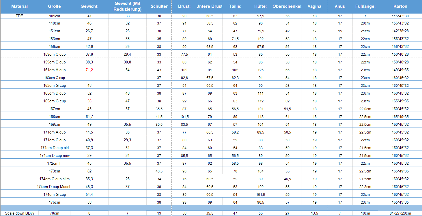Im Dezember 2021 veröffentlichte Zelex die Gewichtsreduzierung für alle Silikonpuppen. Wichtig: Die folgenden Angaben haben Toleranzen.